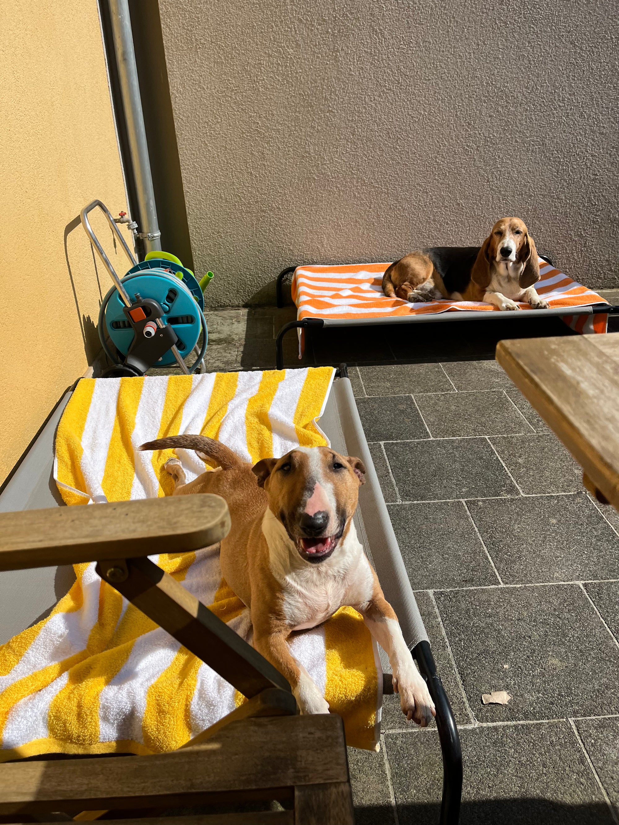 Nom Iessen a bis 14:00 Auer ass et méi roueg, d'Hënn schlofen ofhängeg vun der Saison an hire Preferenzen dobannen oder dobausse.